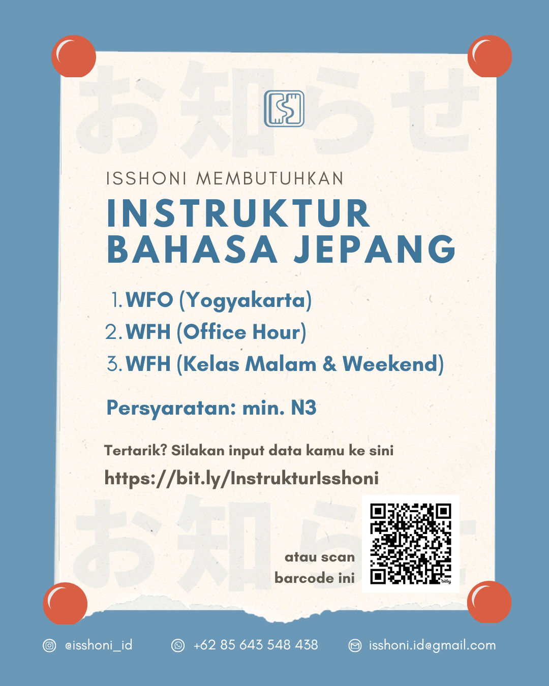 Lowongan: Instruktur Bahasa Jepang Kami sedang mencari Instruktur bahasa Jepang. Jika kamu tertarik, bisa isi form berikut: Lowongan Instruktur Bahasa Jepang
